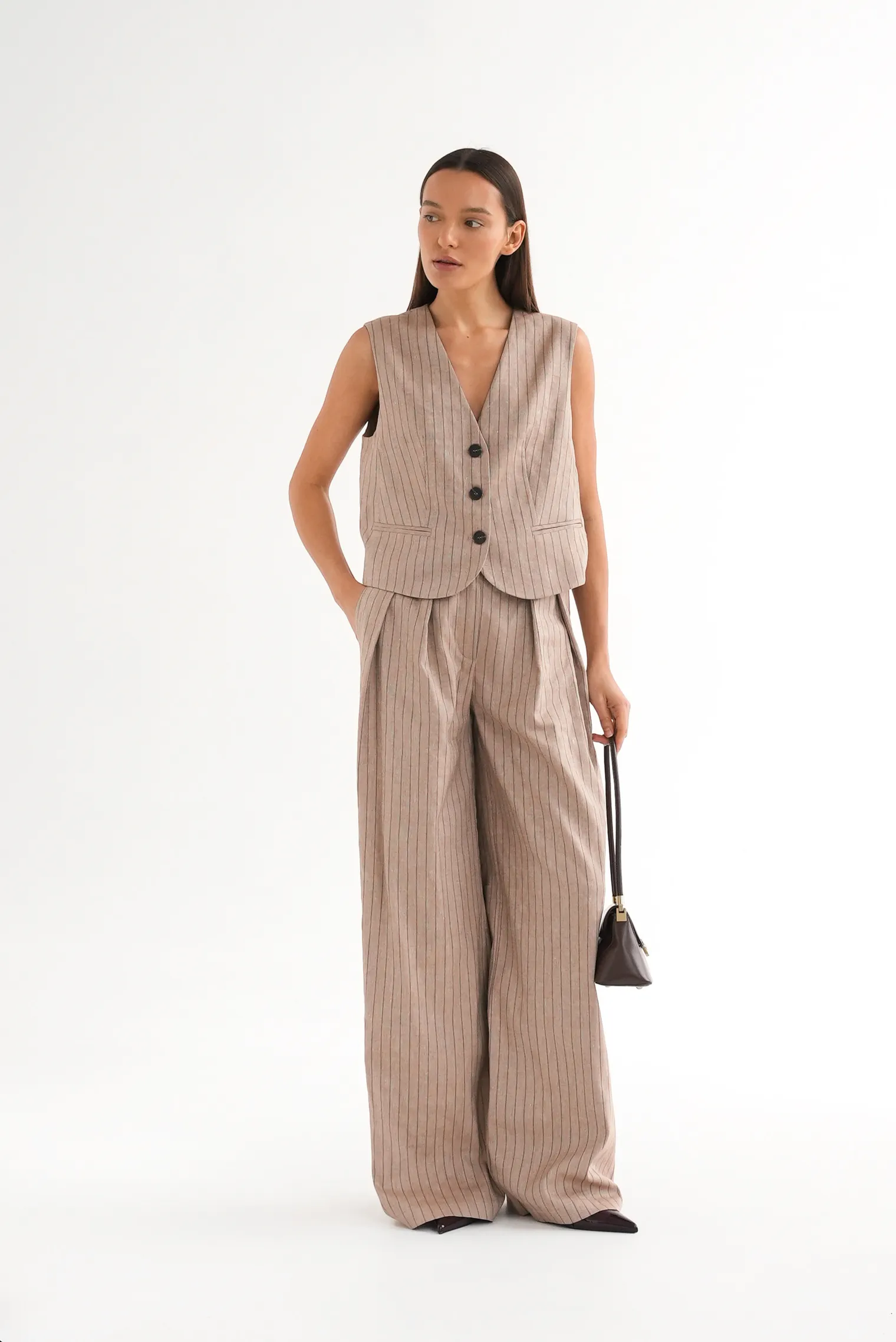 Брюки широкие с поясом изо льна в полоску цвета капучино