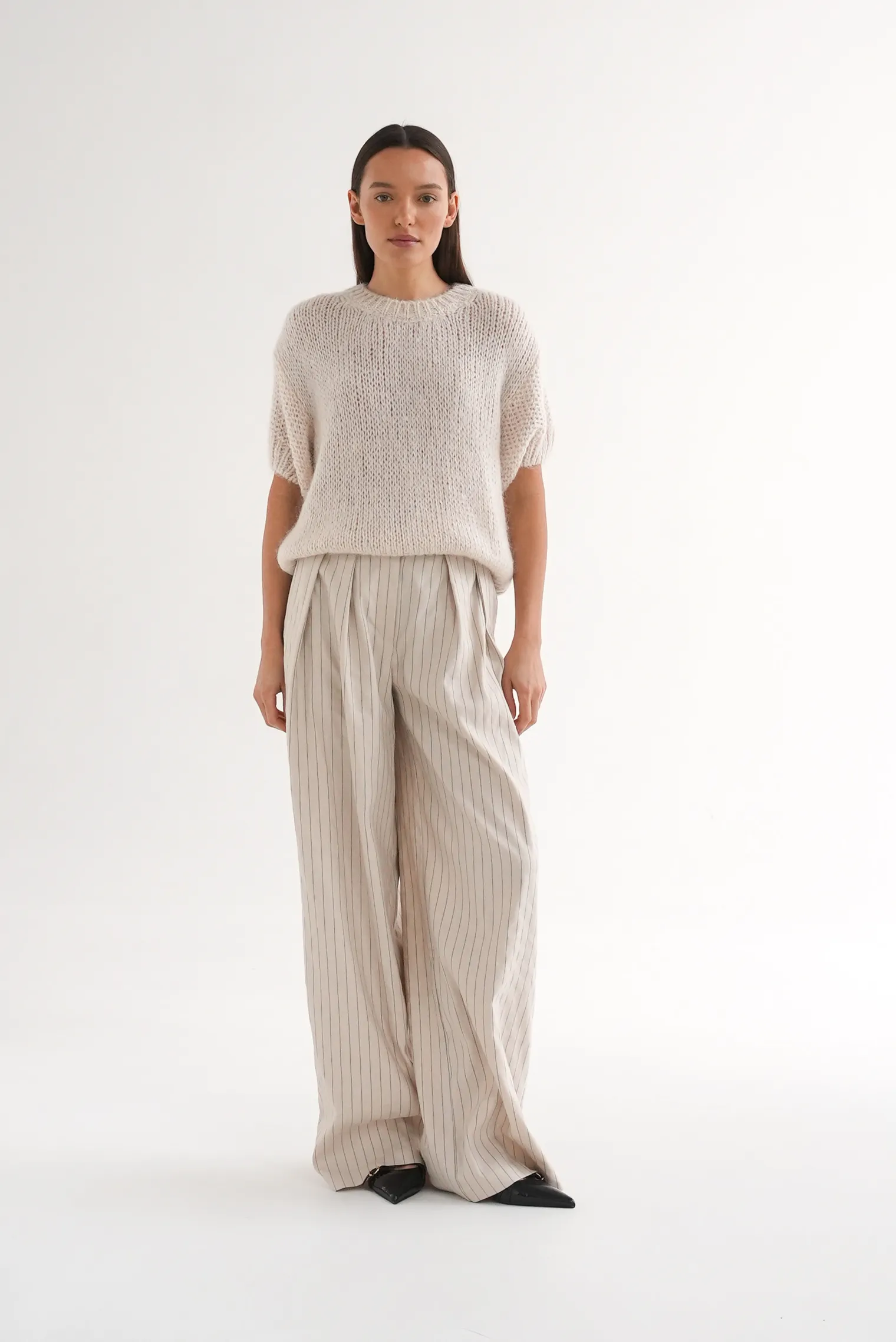 Брюки широкого кроя выполнены из мягкого, приятного к телу материала, который хорошо держит форму и сохраняет аккуратный вид даже после длительной носки. Ткань с лёгкой текстурой и тонкой полоской придаёт модели утончённый, изысканный характер. Благодаря спокойному оттенку изделие универсально и гармонично сочетается с рубашками, жилетами или жакетами.