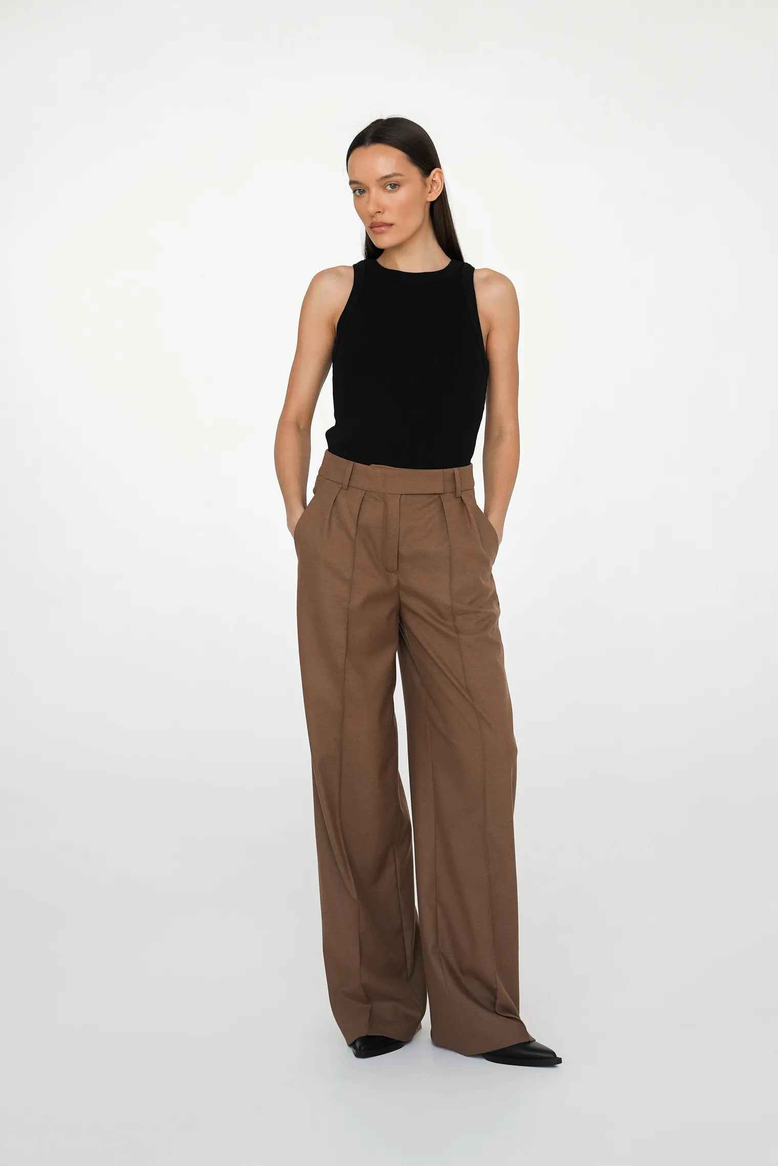 Модель табачного цвета — благородного коричнево-серого оттенка с природной глубиной — отличается продуманной конструкцией классических брюк со складками у пояса, которые создают элегантный объем в области бедер и формируют мягкую драпировку, и отстроченными стрелками по переду, визуально вытягивающими силуэт. Пояс притачной на плотном корсаже, что исключает деформацию и скручивание при носке, оснащен шлевками для ремня. Два функциональных кармана расположены в боковых швах, сохраняя чистоту линий и обеспечивая практичность.