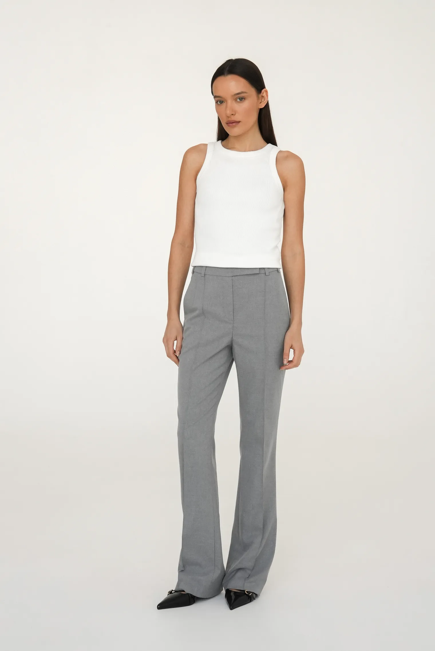 Благодаря универсальному пепельному оттенку и эффектному крою брюки ADLI открывают широкие стилистические возможности: носите их с приталенным жакетом из комплекта и туфлями-лодочками для деловых встреч и официальных мероприятий, с шелковой блузой и босоножками на каблуке для романтичных выходов, с тонким джемпером и лоферами для повседневных офисных образов, с топом и жакетом наброшенным на плечи для создания элегантных многослойных комплектов либо с водолазкой и ботильонами для стильных городских луков с ретро-акцентом.