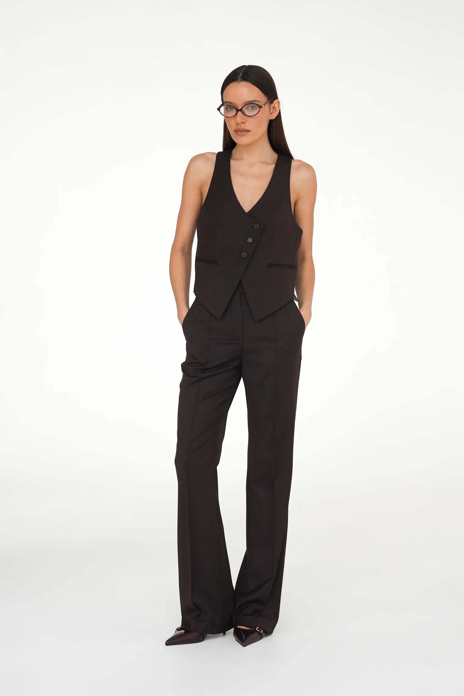Благодаря универсальному насыщенному оттенку горького шоколада и эффектному крою брюки ADLI открывают широкие стилистические возможности: носите их с приталенным жакетом из комплекта и туфлями-лодочками для деловых встреч и официальных мероприятий, с кремовой шелковой блузой и босоножками на каблуке для романтичных выходов, с тонким кашемировым джемпером и лоферами для повседневных офисных образов, с топом и жакетом, наброшенным на плечи, для создания элегантных многослойных комплектов либо с водолазкой и ботильонами для стильных городских луков с ретро-акцентом.