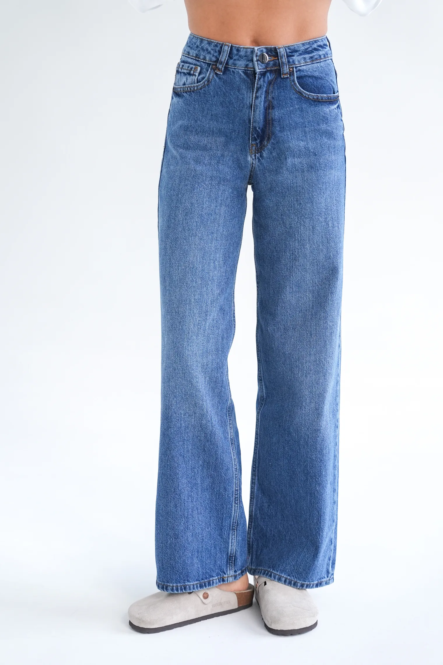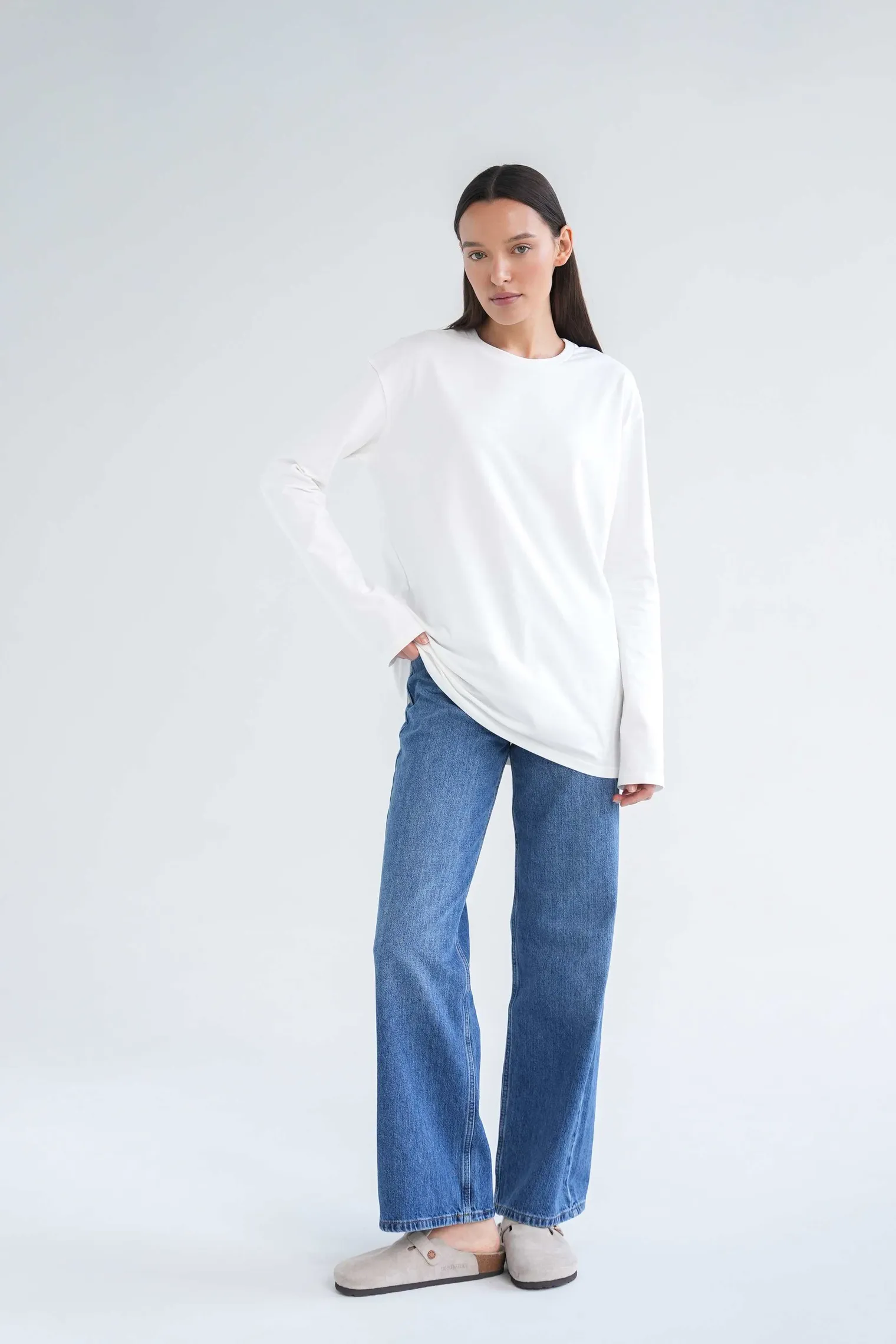 Джинсы выполнены из плотного денима и имеют широкий прямой крой с завышенной линией талии. Посадка фиксируется притачным поясом, на котором расположены шлёвки под ремень. Застёжка классического типа — на молнию и пуговицу. В конструкции предусмотрены боковые карманы, а спинка дополнена V-образной кокеткой и двумя накладными карманами, что формирует аккуратную посадку и поддерживает силуэт.