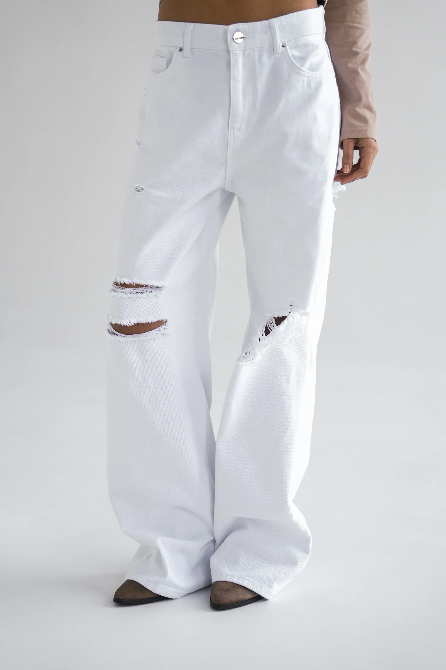 Джинсы выполнены из плотного хлопкового денима и имеют свободный прямой крой. В конструкции предусмотрены разрезы на передней и задней половинах, что подчёркивает характер модели и создаёт дополнительный акцент на линиях брючин. Посадка фиксируется притачным поясом со шлёвками под ремень. Классическая застёжка на молнию и пуговицу обеспечивает надёжную фиксацию. Спинка оформлена V-образной кокеткой и двумя накладными карманами, что формирует устойчивую посадку.