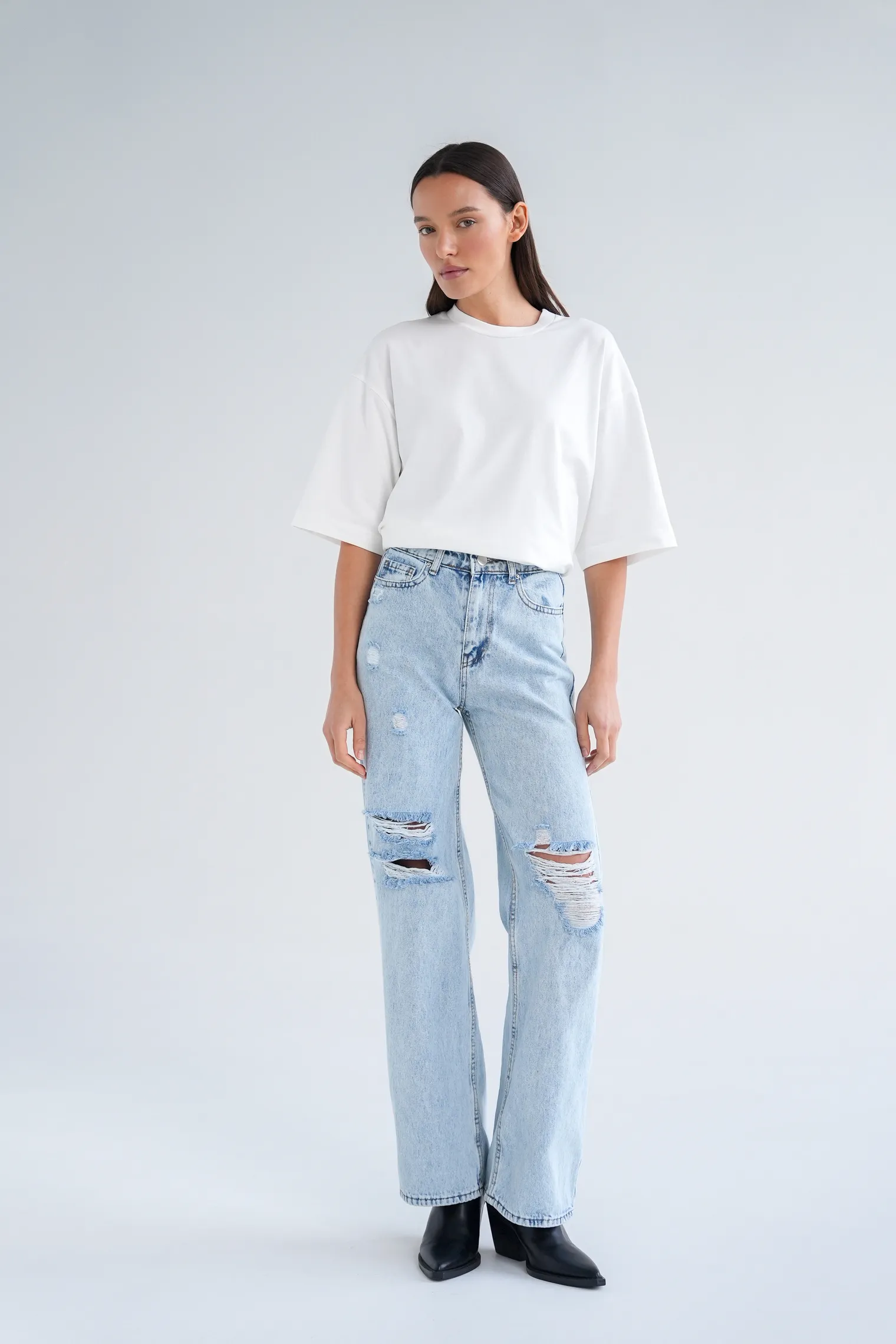 Джинсы свободного кроя с разрезами цвета голубая варка