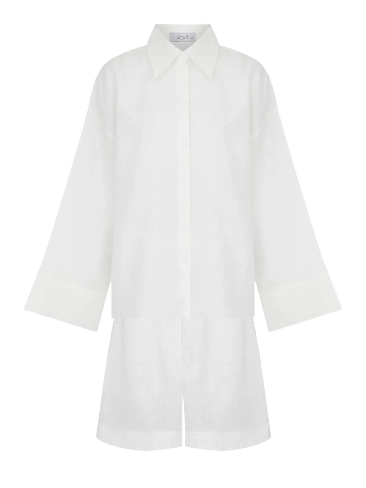 Комплект изо льна: рубашка свободного кроя с длинными рубашечными рукавами, отложным воротником, застёжкой на пуговицы. Шорты свободного кроя с ложной застёжкой, резинкой в поясе и карманами в боковых швах.