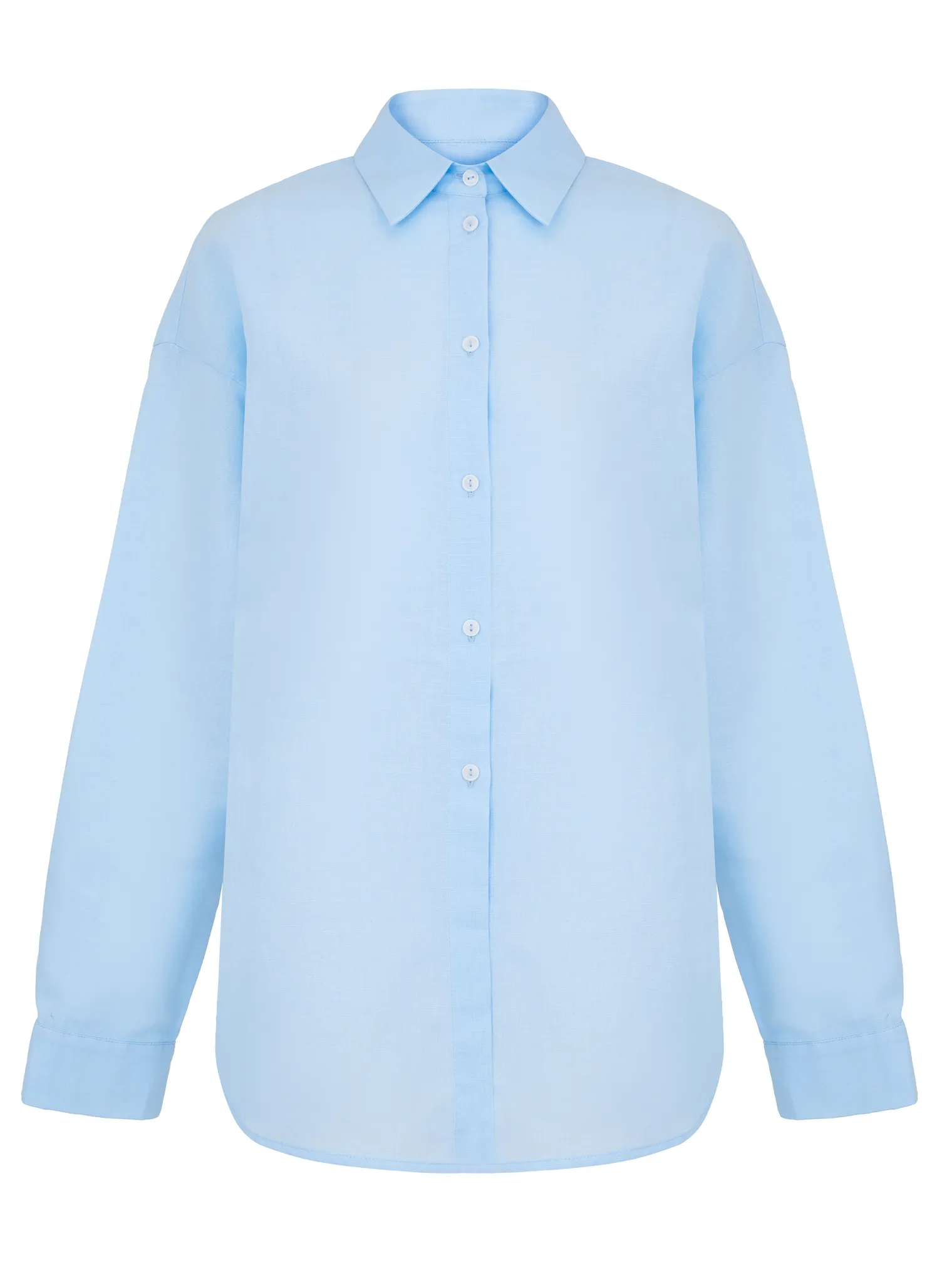 Рубашка свободного кроя создаёт мягкую вертикаль и не ограничивает движения. Классические рубашечные рукава дополнены манжетами, подчёркивающими аккуратность линии запястья. Отложной воротник усиливает структурность и делает модель более собранной, а застёжка на пуговицы позволяет варьировать посадку — носить рубашку полностью застёгнутой или слегка раскрытой. Фигурный низ добавляет динамику и облегчает силуэт, органично сочетаясь с прямыми и широкими брюками.