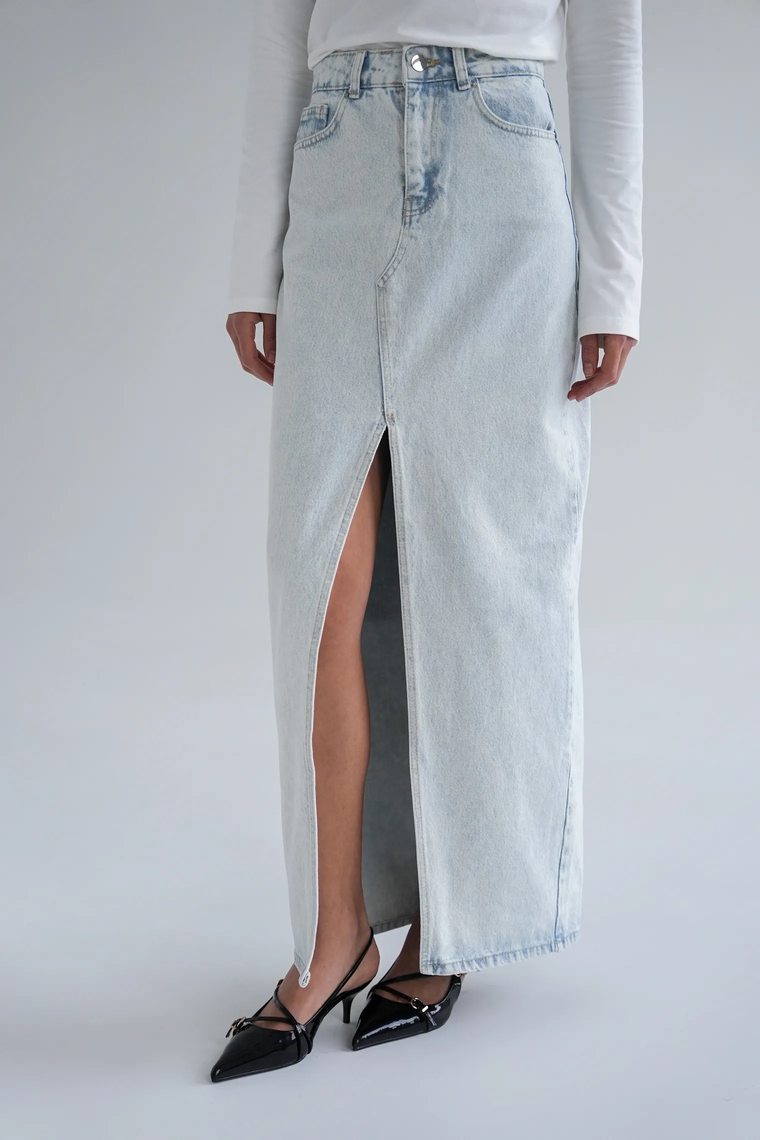 Фигурный разрез спереди добавляет пластичность движению, делая шаг свободным и естественным. Он становится ключевой деталью модели: подчёркивает длину, делает образ визуально легче и добавляет современный акцент. Бахрома по низу поддерживает характер денима и создаёт лёгкую динамику, сохраняя при этом аккуратный внешний вид. Этот приём делает изделие интересным, не нарушая целостности силуэта.
