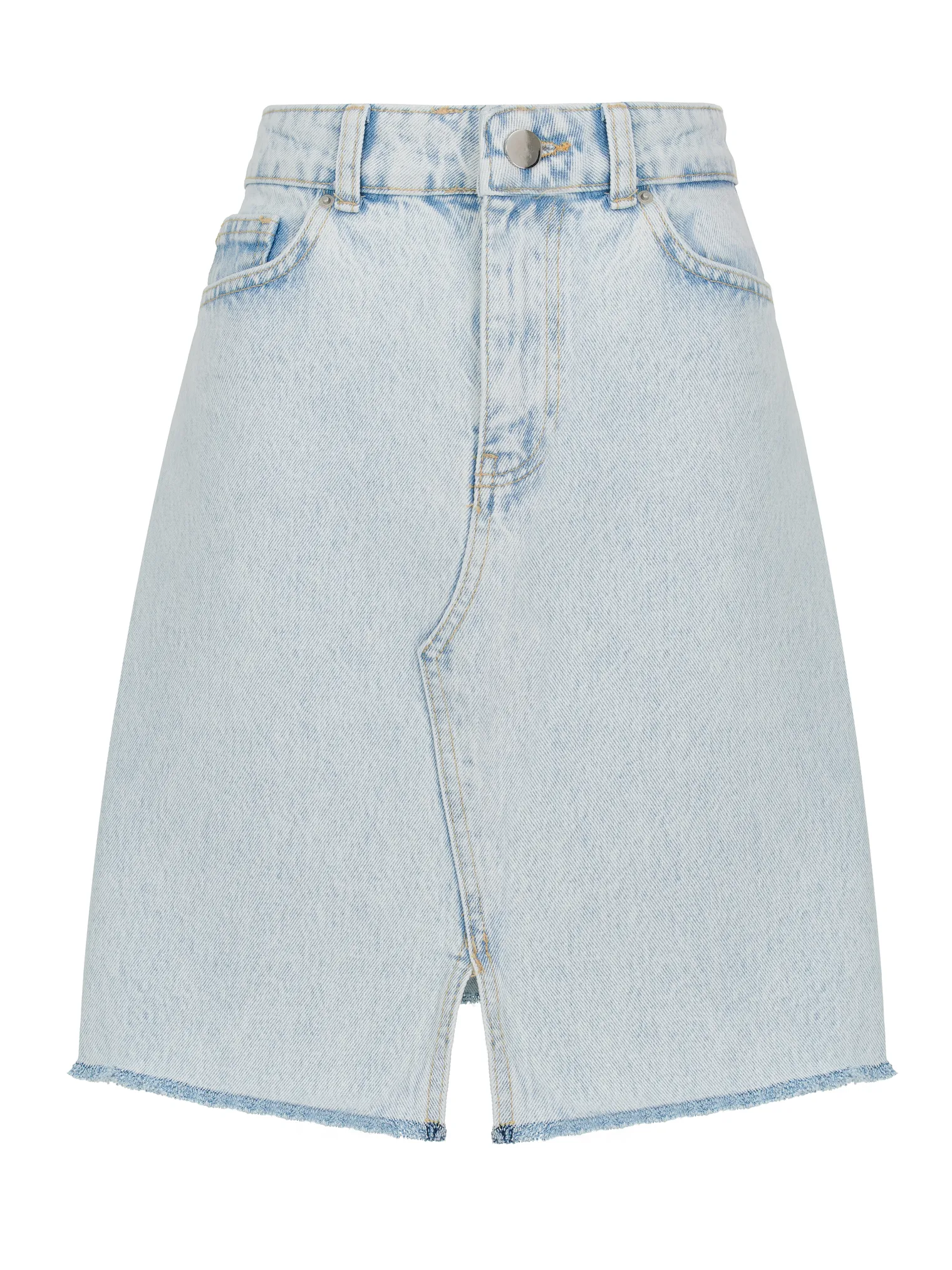 Юбка удлинённая, прямого силуэта, с фигурным разрезом. Пояс со шлёвками под ремень. Застёжка на молнию и пуговицу.