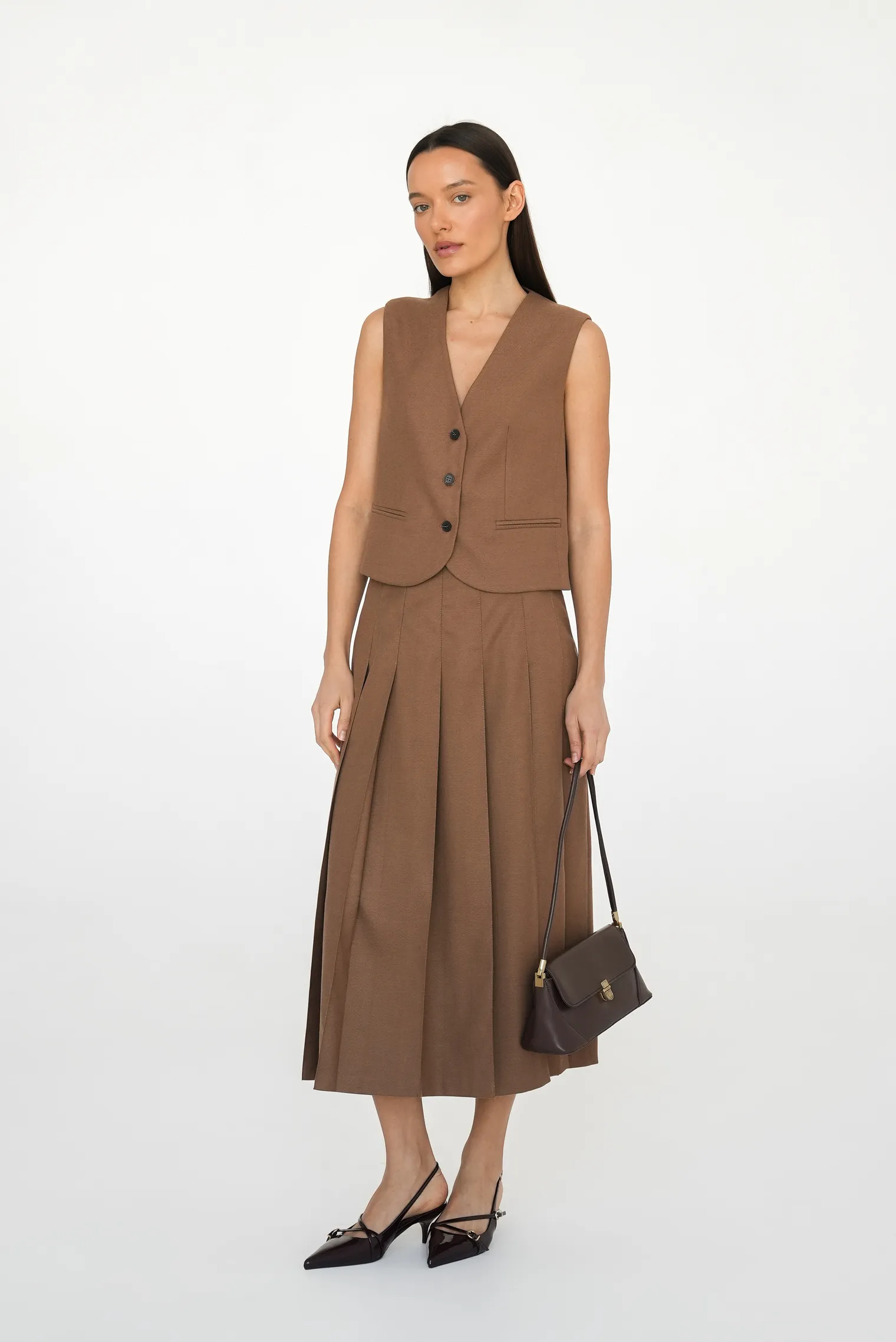К юбке предлагаются жакет и жилет такого же табачного цвета — обладатель получает готовый костюмный комплект из трех предметов для создания безупречных total-образов с максимальной вариативностью.