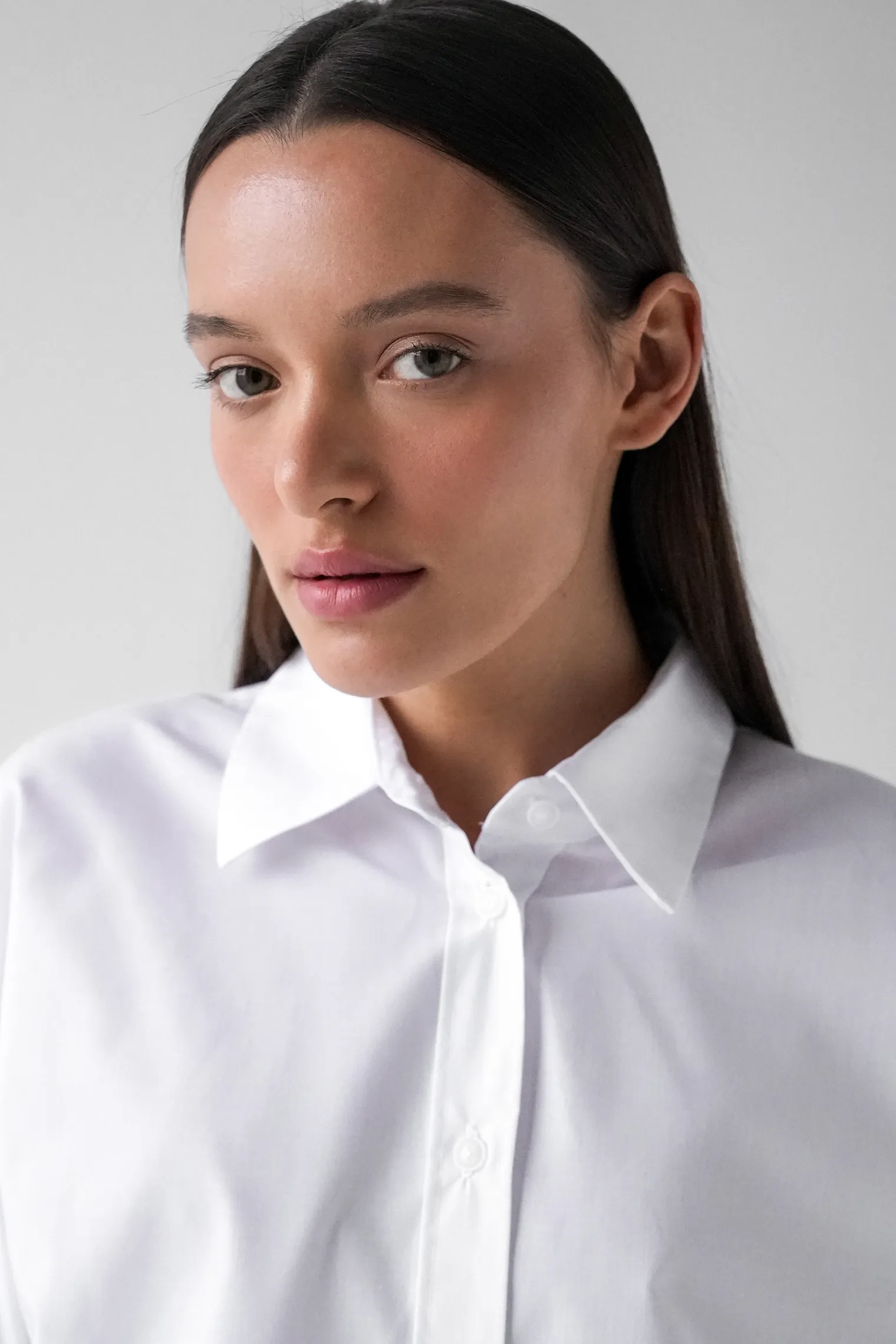 Блуза прямого силуэта с длинными рубашечными рукавами с манжетами, отложным воротником на стойке, центральной супатной застёжкой. Низ скругленный.