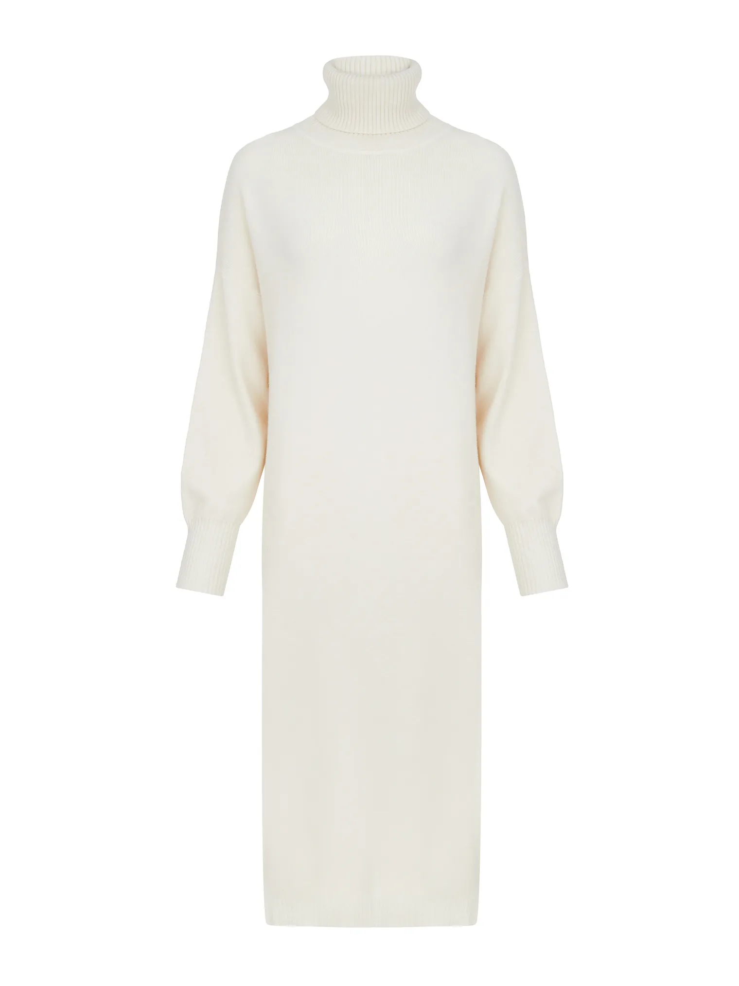 Платье миди мелкой вязки с высоким воротником молочного цвета