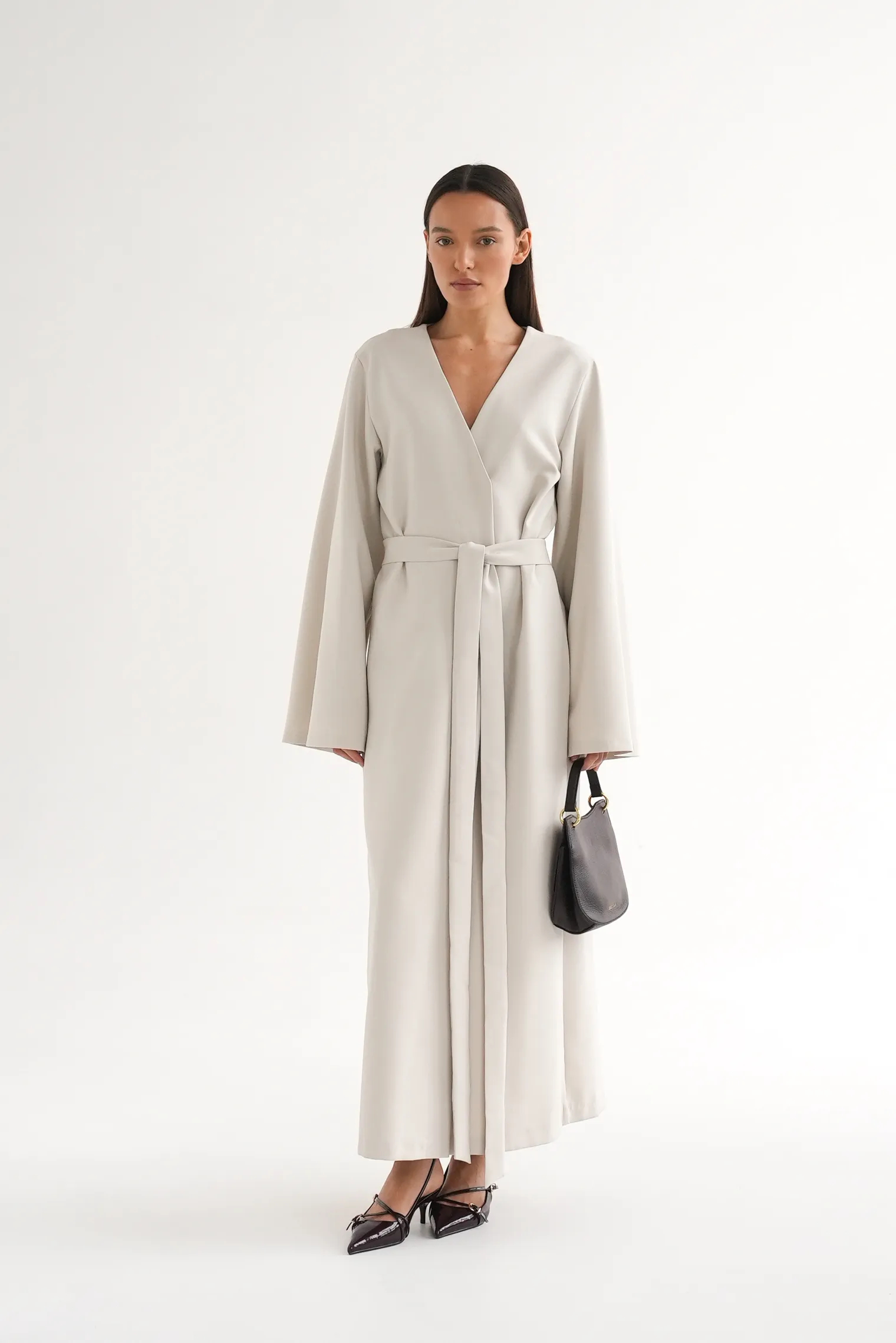 Платье миди с поясом и широкими рукавами выполнено в удлинённом силуэте, который подчёркивает вертикаль и создаёт элегантную, спокойную линию образа. Конструкция построена на плотной костюмной ткани, благодаря чему изделие хорошо держит форму и сохраняет аккуратный вид при движении. Прямой удлинённый крой визуально вытягивает силуэт, а мягкая пластичность материала делает посадку комфортной и сбалансированной. Модель лишена лишних деталей, что подчёркивает её современную минималистичную эстетику.