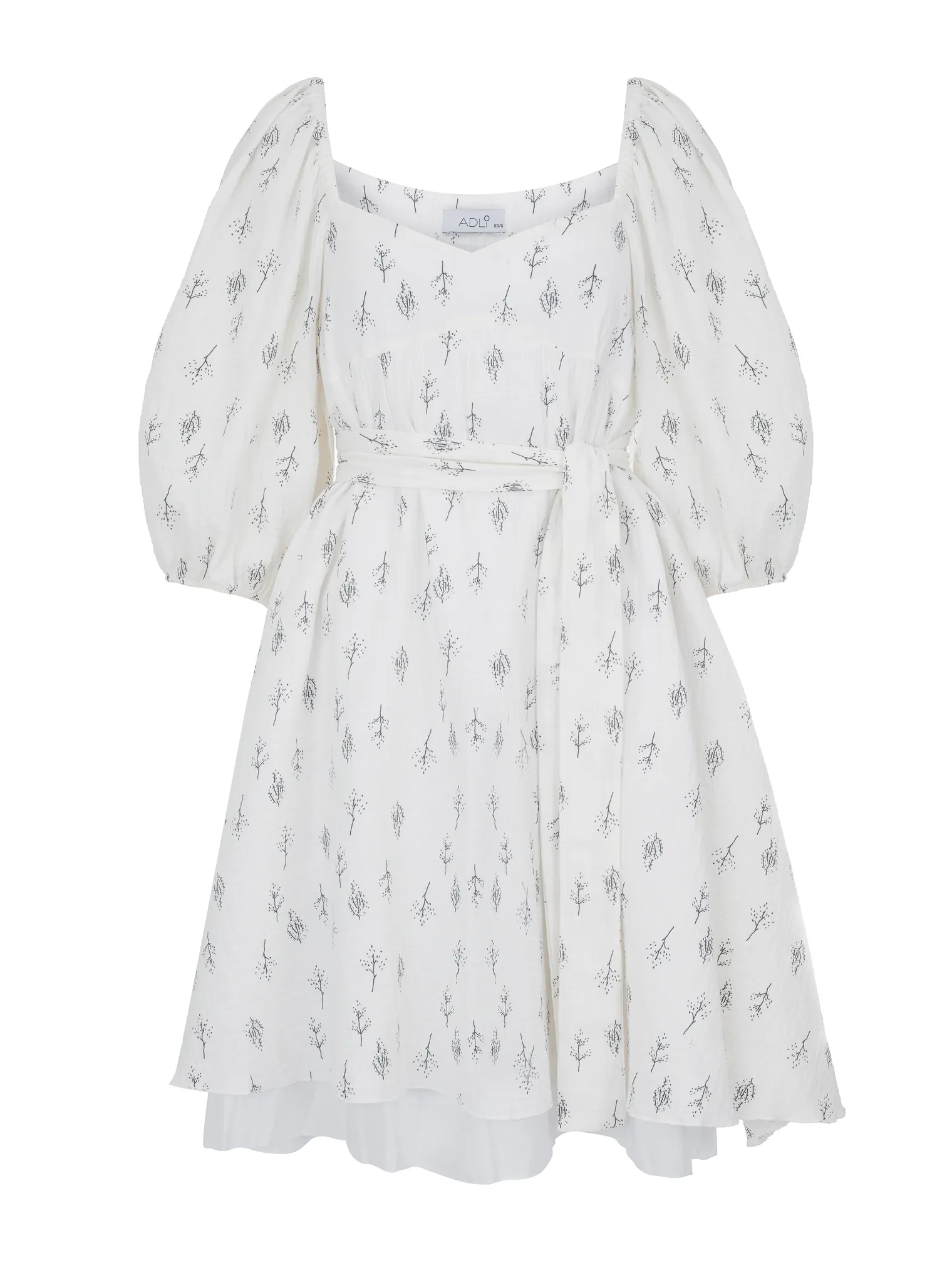 Платье мини с поясом с принтом веточки в цвете белый/черный