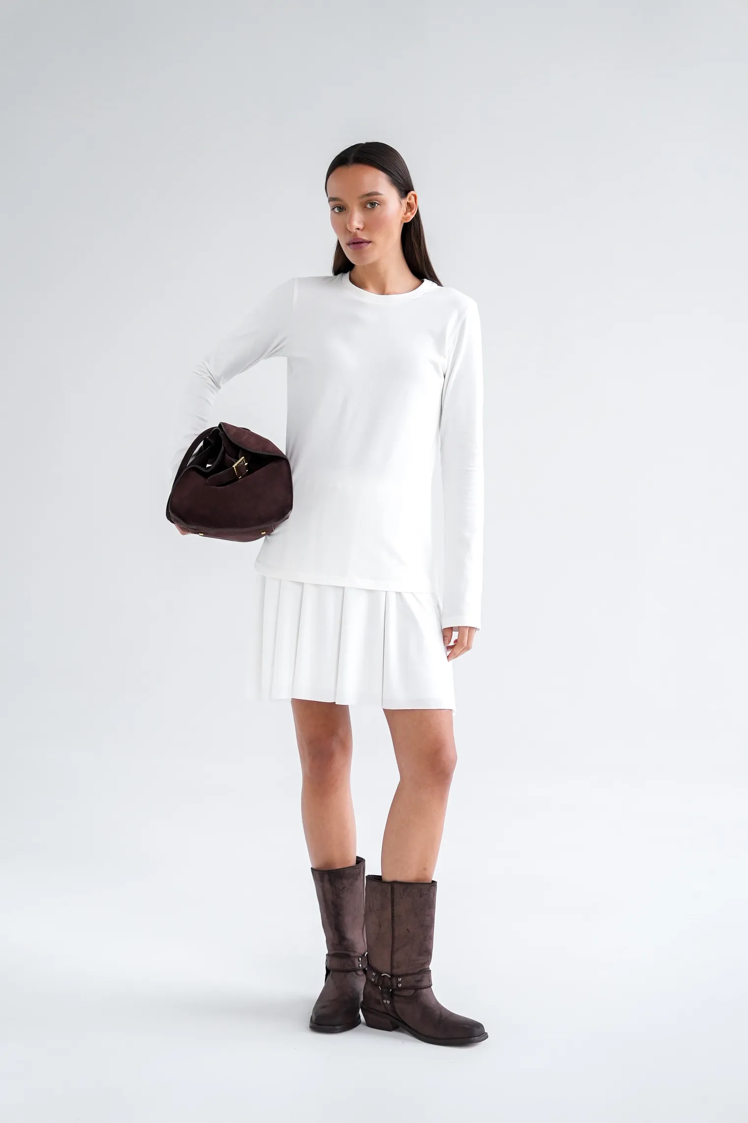 Лонгслив выполнен из мягкого хлопкового полотна компакт пенье с плотностью 180 г, благодаря чему ткань сохраняет ровную фактуру, устойчивость к деформации и ощущается комфортной при ежедневной носке. Прямой силуэт обеспечивает свободную посадку без излишнего прилегания, позволяя сочетать изделие как в самостоятельном варианте, так и в многослойных образах. Втачные рукава формируют аккуратную линию плеча и не ограничивают движения, сохраняя лёгкость и пластичность материала в процессе носки.