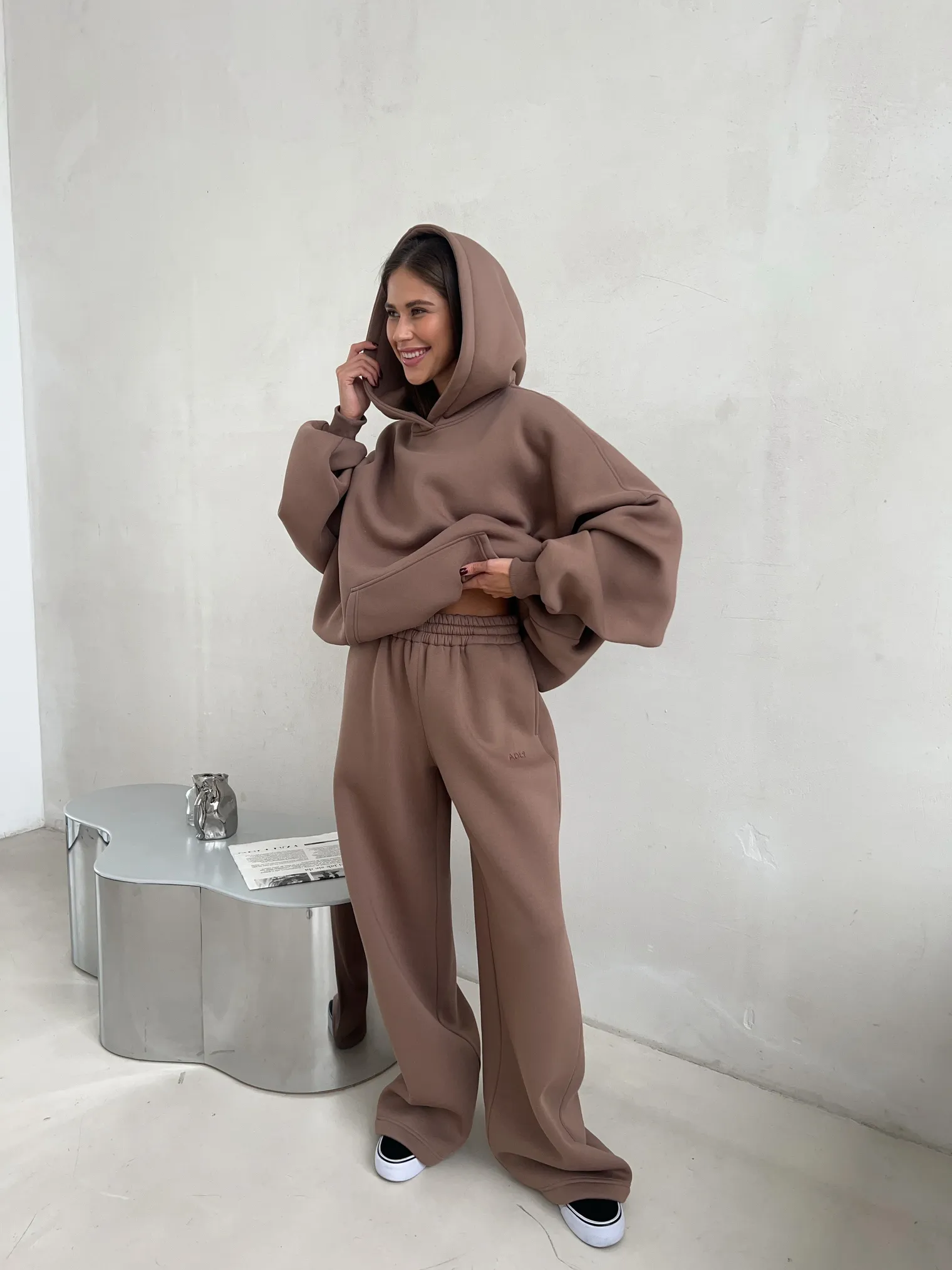 Брюки трикотажные прямого кроя выполнены из плотной ткани с мягкой внутренней стороной, обеспечивающей комфорт и тепло. Модель имеет пояс на резинке со шнуром, который позволяет регулировать посадку и фиксирует изделие на талии. Карманы расположены в боковых швах, что сохраняет лаконичный внешний вид и добавляет функциональности. По низу брюк предусмотрена кулиса со шнуром, позволяющая менять силуэт — от прямого до слегка зауженного.