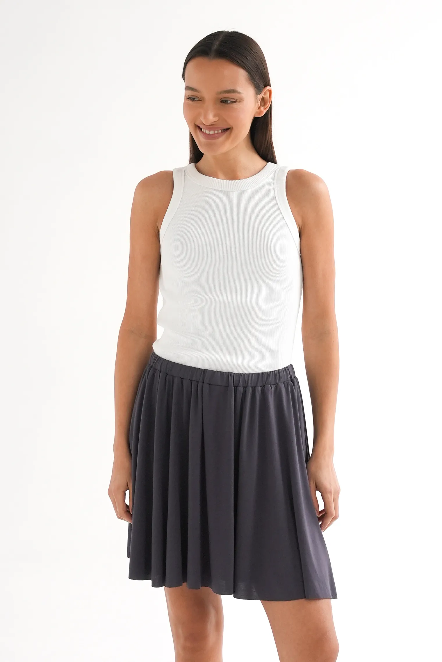Укороченная трикотажная юбка — это комфортная и универсальная модель, которая подчёркивает лёгкость и непринуждённость образа. Благодаря мягкой фактуре и эластичности материал приятно прилегает к телу и обеспечивает свободу движений. Двойная структура делает изделие более плотным, помогает сохранить форму и создаёт аккуратный внешний вид даже при активном ритме дня. Такая юбка подходит для прогулок, отдыха, занятий спортом в лёгком стиле и повседневных летних образов.