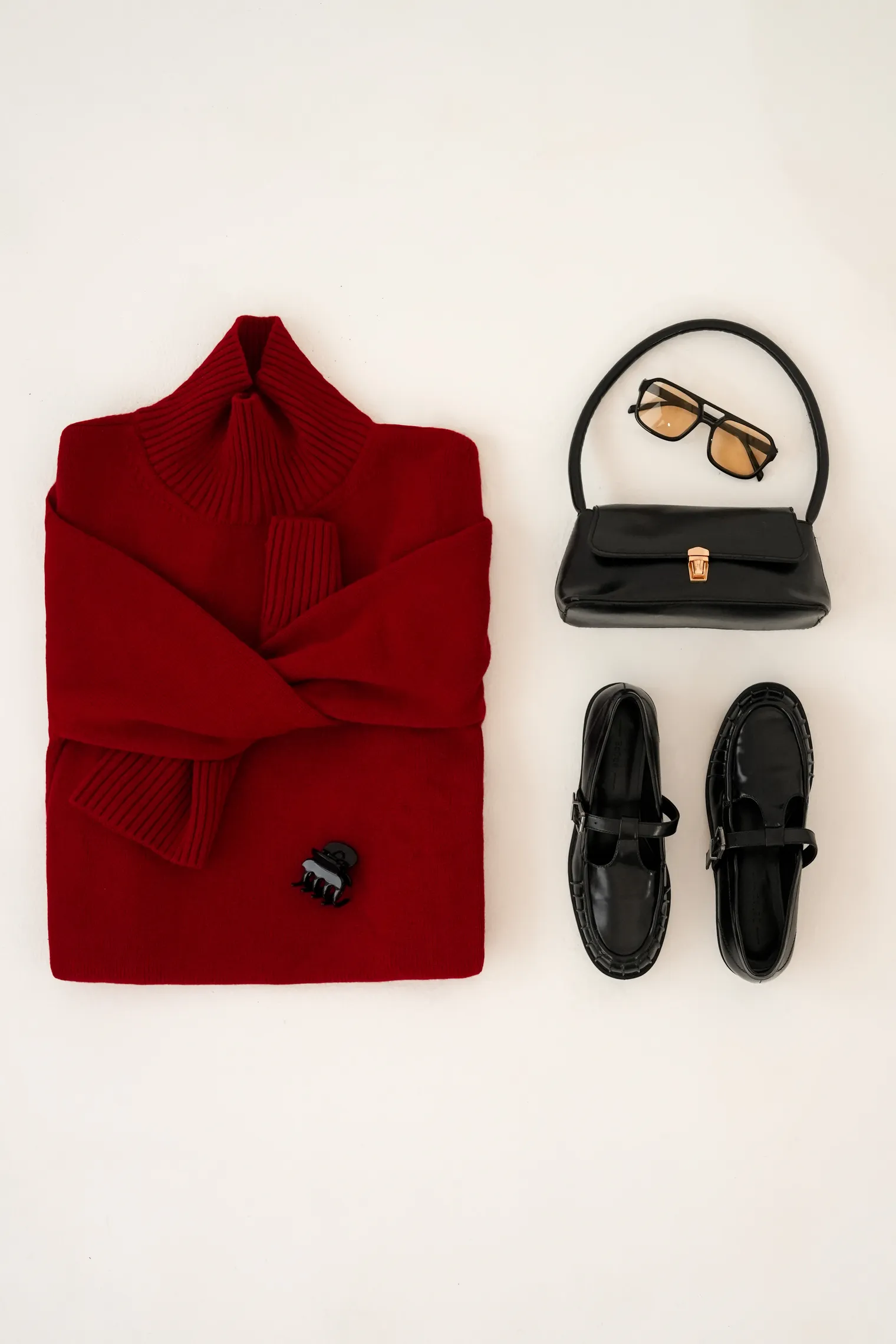 Джемпер мелкой вязки с высоким воротником красного цвета