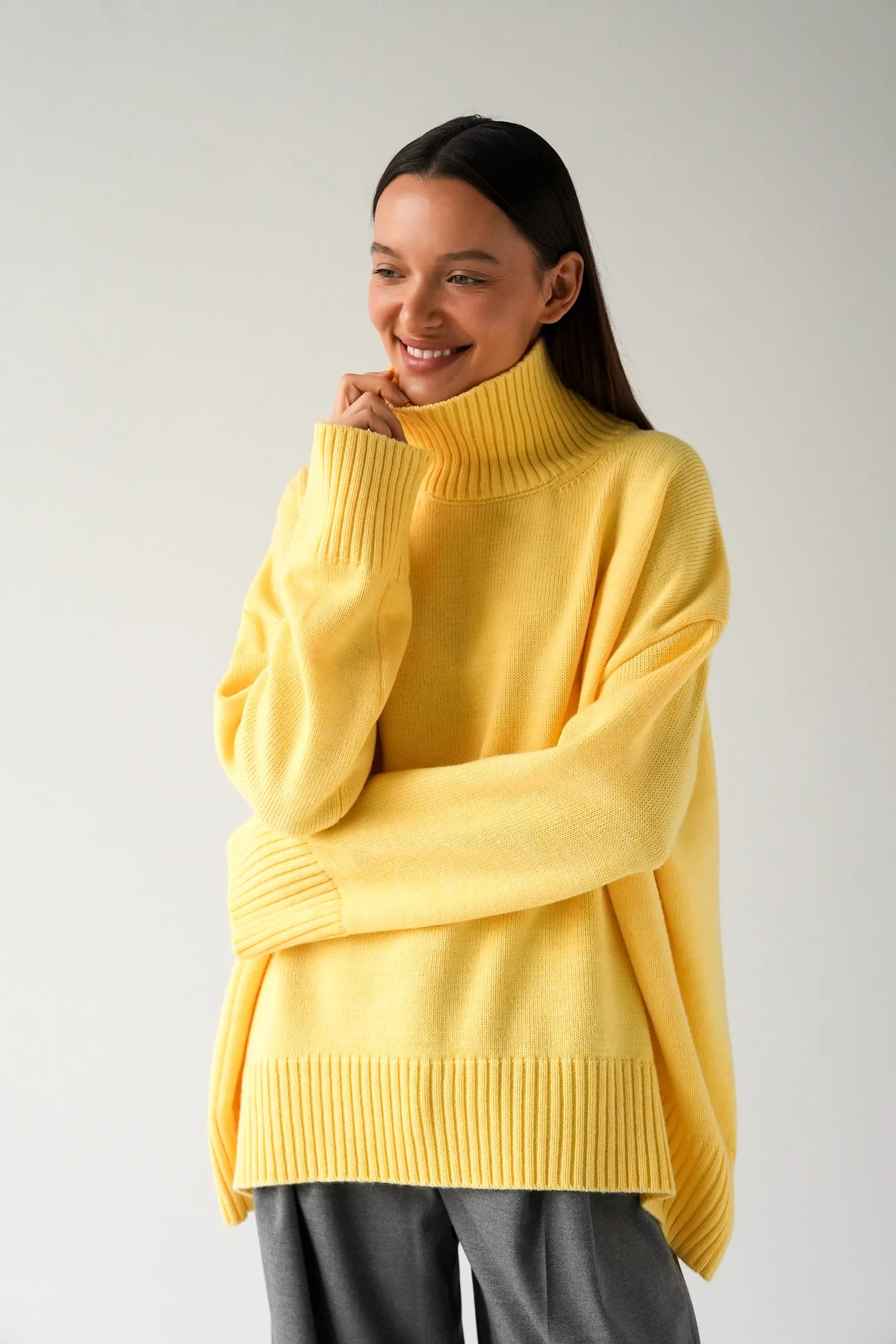 Джемпер выполнен из трикотажа мелкой вязки и имеет удлинённый силуэт со свободной посадкой. Высокий воротник-стойка создаёт плотный вертикальный контур и хорошо держит форму. Линия плеча слегка спущена, что обеспечивает мягкий переход и подчёркивает объём изделия. Рукава выполнены в классической форме с аккуратной обработкой края и равномерным распределением полотна.