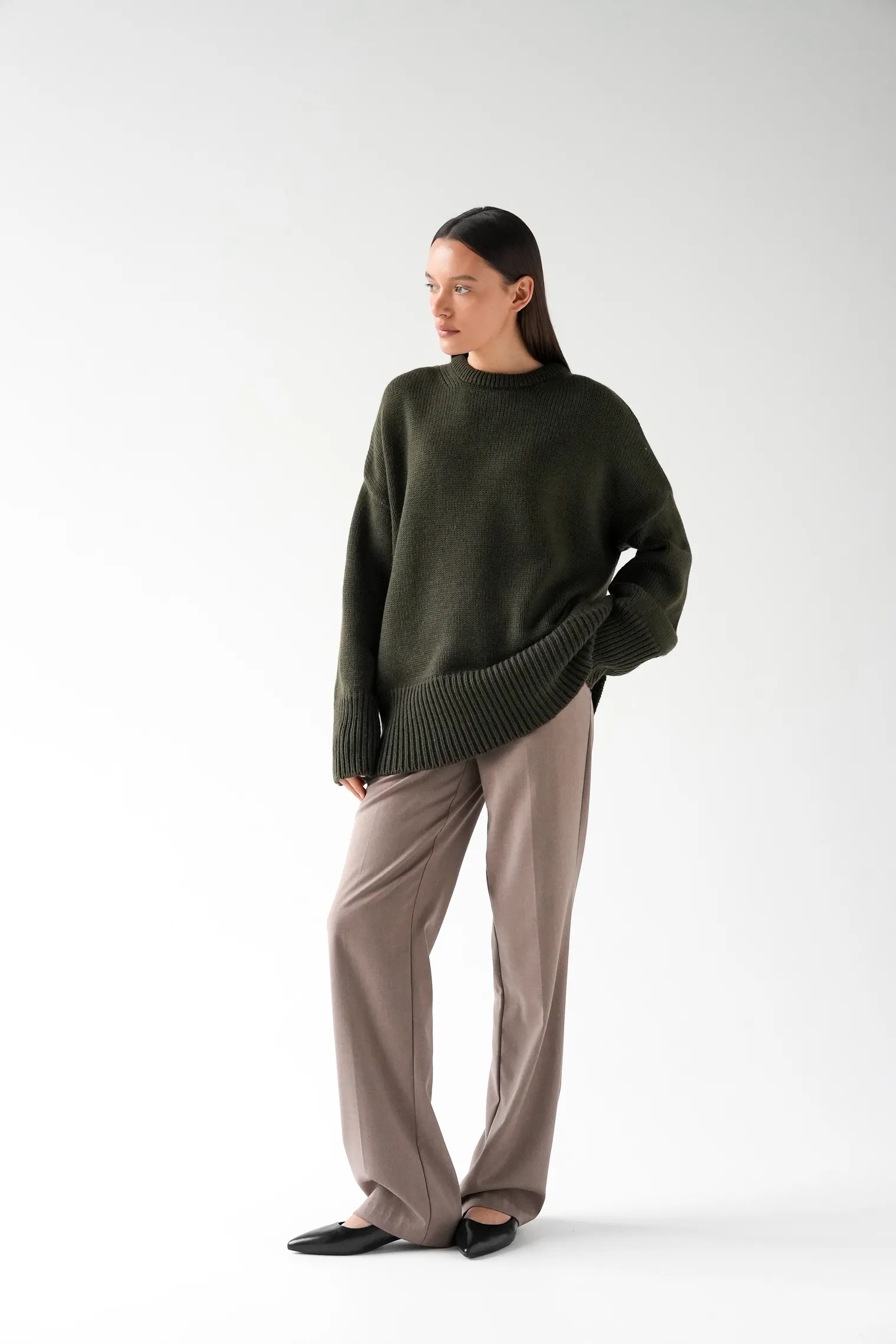Джемпер выполнен из плотного трикотажа крупной вязки и имеет удлинённый силуэт со свободной посадкой. Мягкая линия плеча формирует плавный переход, подчёркивая объём модели. Горловина оформлена низким округлым воротником, который создаёт аккуратный контур без плотного прилегания. Низ и манжеты выполнены в классической форме, стабилизируя посадку и сохраняя чистоту линии.