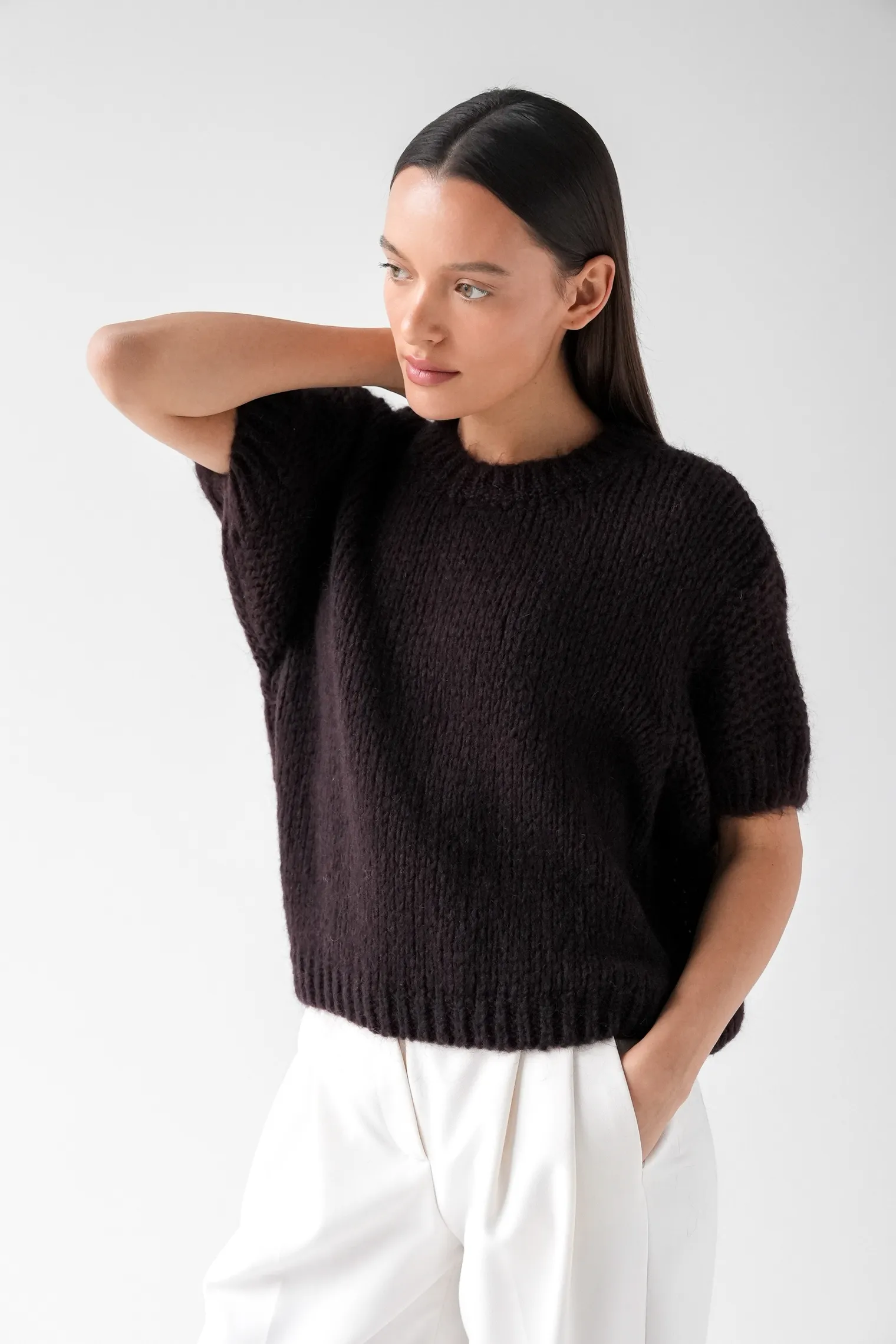 Укороченный рукав визуально облегчает верхнюю часть силуэта, создаёт правильные пропорции и делает посадку более универсальной. Такой крой легко вписывается как в образы с плотными брюками, так и с мягкими юбками или прямыми моделями длины миди. Благодаря крупной вязке пуловер держит форму, но остаётся пластичным, подстраивается под движения и сохраняет аккуратный внешний вид.