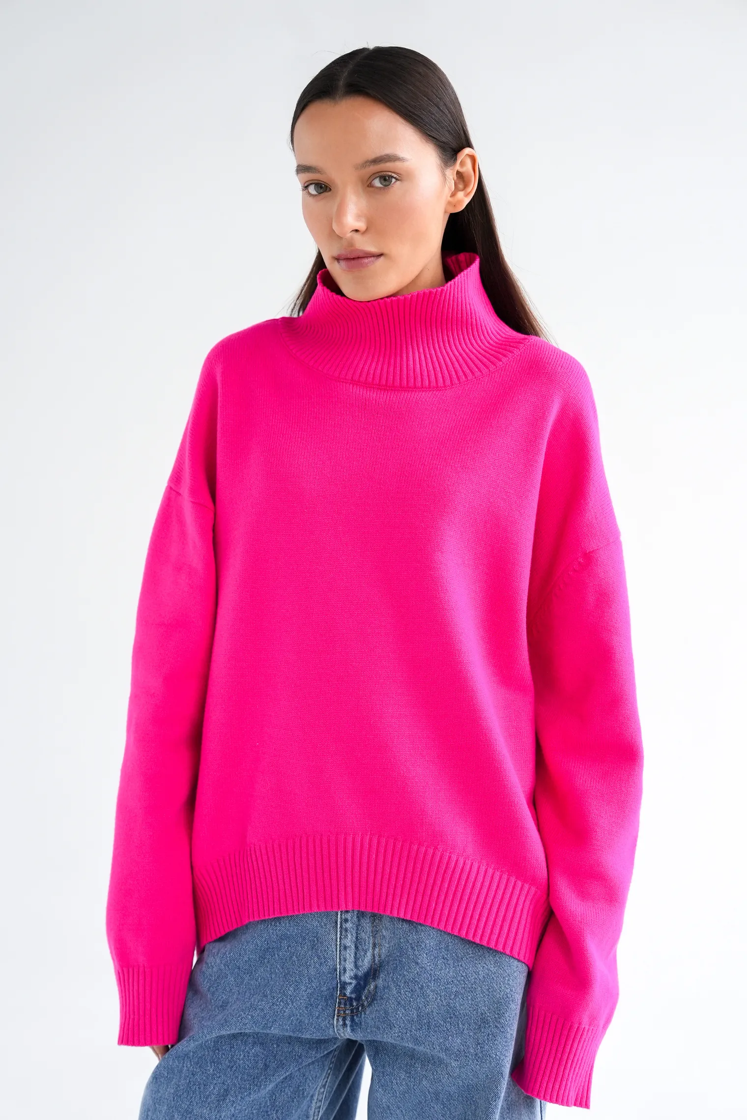 Джемпер мелкой вязки с высоким воротником цвета фуксии