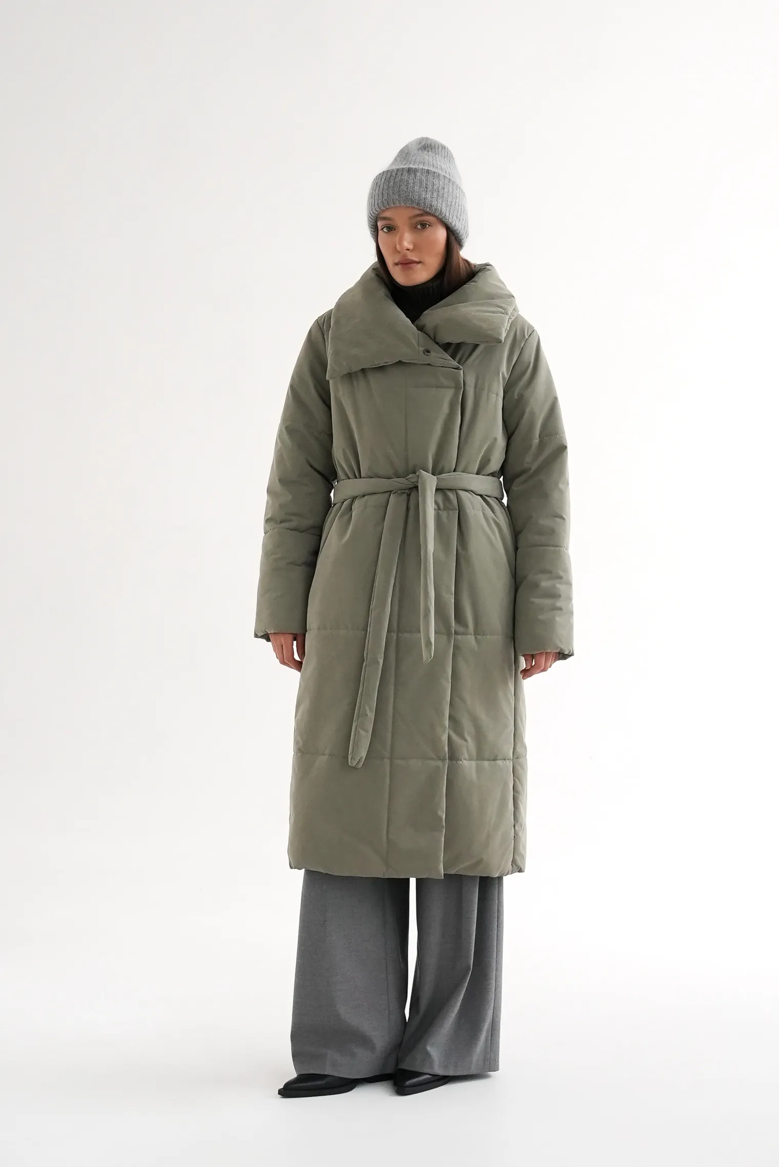 Стеганое пальто с высоким воротником оливкового цвета