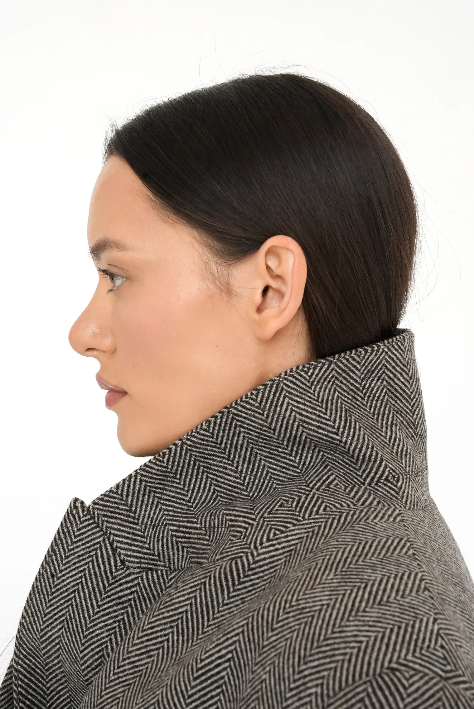 Модель шоколадного цвета с классическим рисунком «в елочку» отличается эксклюзивными деталями премиального уровня: борт пальто обработан декоративным контрастным кантом, который подчеркивает архитектуру прямого кроя и добавляет графической выразительности, а на стойке английского воротника выполнена аккуратная вышивка с логотипом бренда ADLI, маркирующая принадлежность к коллекции повышенного качества.