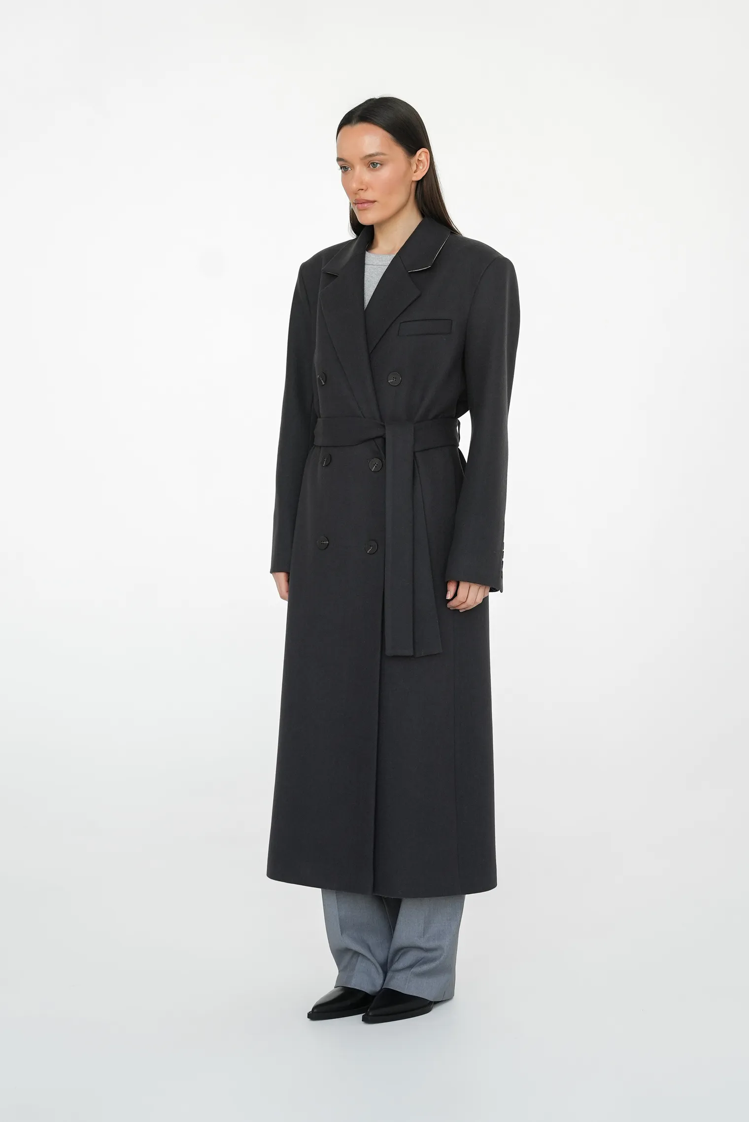 Спинка выполнена со средним швом, который фиксирует форму и помогает изделию сохранять ровную линию. Шлица делает шаг свободным и позволяет пальто мягко раскрыться при движении. Пояс съёмный, продет в шлёвки, благодаря чему можно менять характер силуэта: носить изделие свободно или акцентировать талию. Карманы расположены в рельефах полочек, оформлены листочками и интегрированы так, чтобы сохранить чистоту передних деталей. Подкладка притачана по линии низа, обеспечивая стабильное распределение объёма и аккуратную посадку по всей длине.