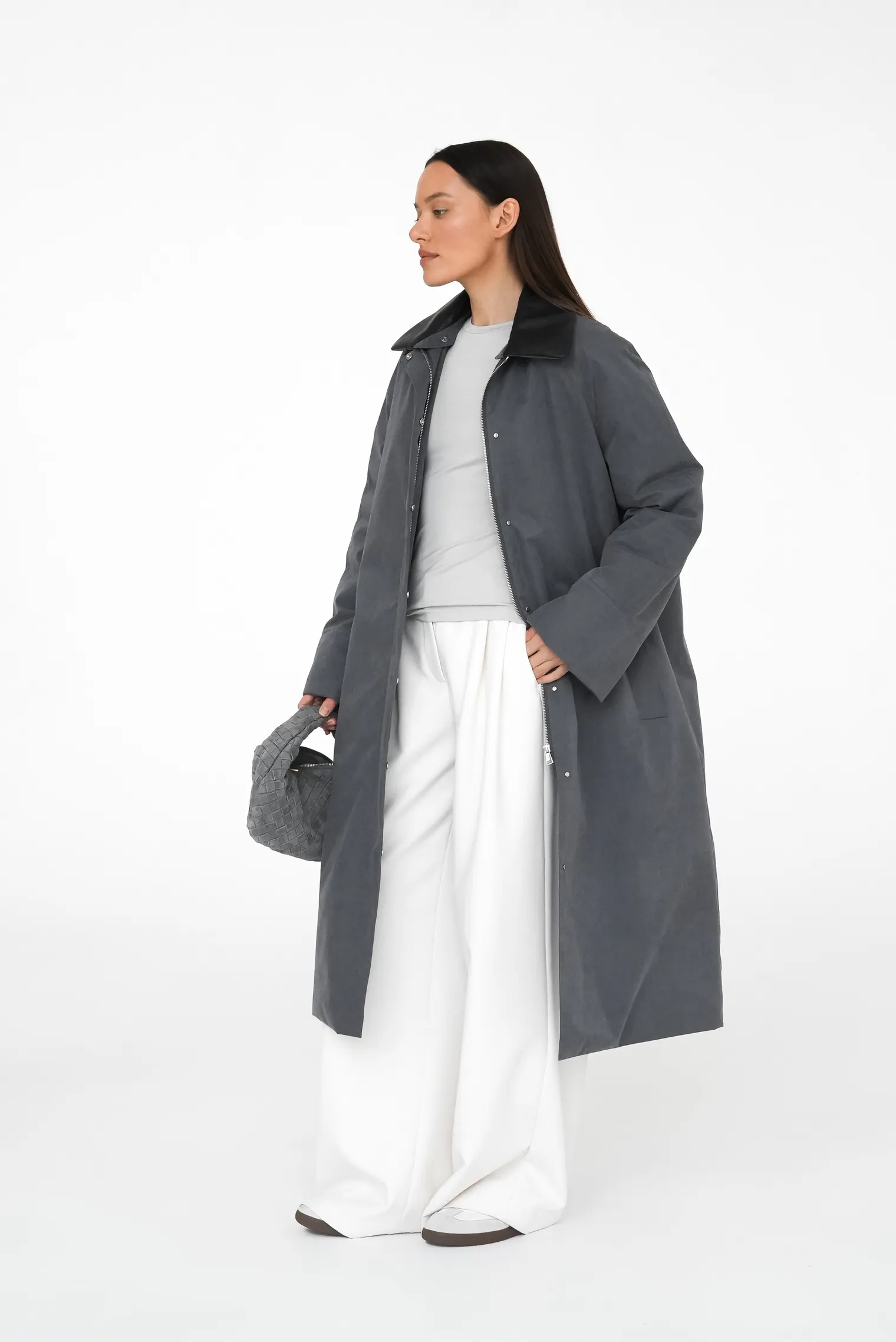 Благодаря универсальному графитовому оттенку и функциональному дизайну плащ ADLI открывает широкие стилистические возможности: носите его с классическими черными брюками и водолазкой для монохромных деловых образов, с платьем-футляр и ботильонами для романтичных выходов, с джинсами и объемным свитером для повседневных прогулок, с серым костюмом в тон для создания элегантных total-образов, с белой футболкой и кедами для контрастных современных луков либо с юбкой-миди и грубыми ботинками для стильных городских комплектов с премиальными деталями.
