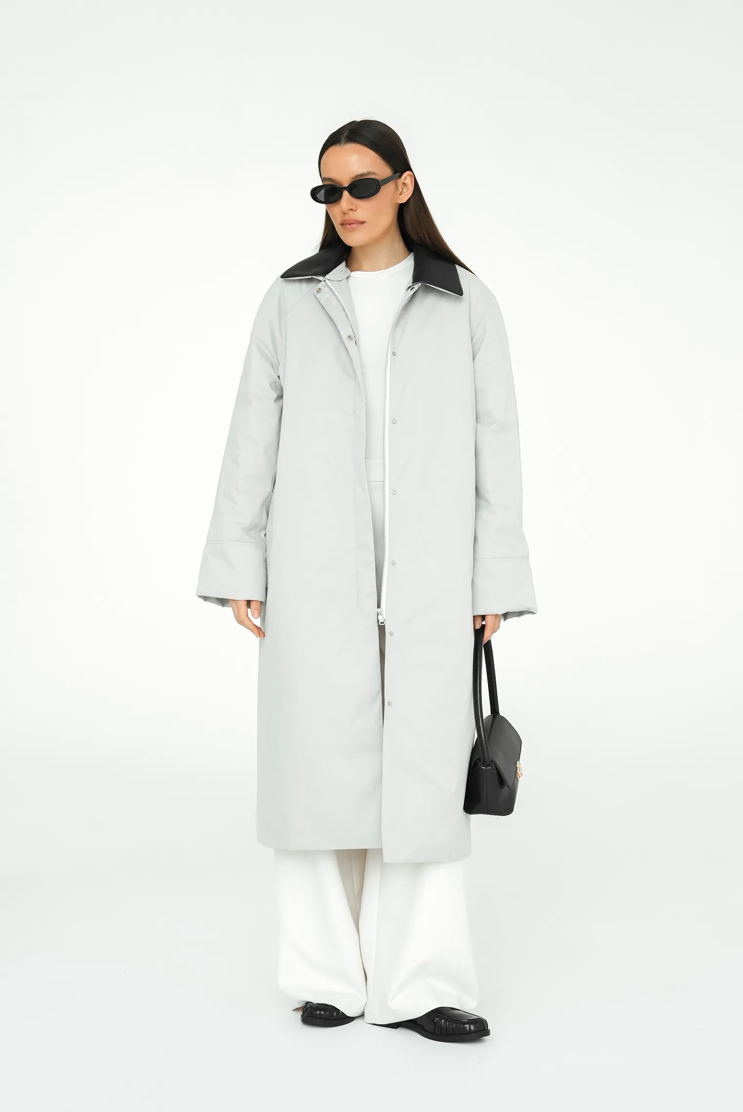 Отложной воротник с отрезной стойкой дополнен съемным элементом из экокожи — это позволяет мгновенно трансформировать образ: пристегнутый воротник добавляет контрастную текстуру и современный акцент, отстегнутый оставляет лаконичную классику. Прорезные карманы оформлены листочками, по воротнику, листочкам и проймам проложены отделочные строчки, подчеркивающие архитектуру кроя и добавляющие графичности.